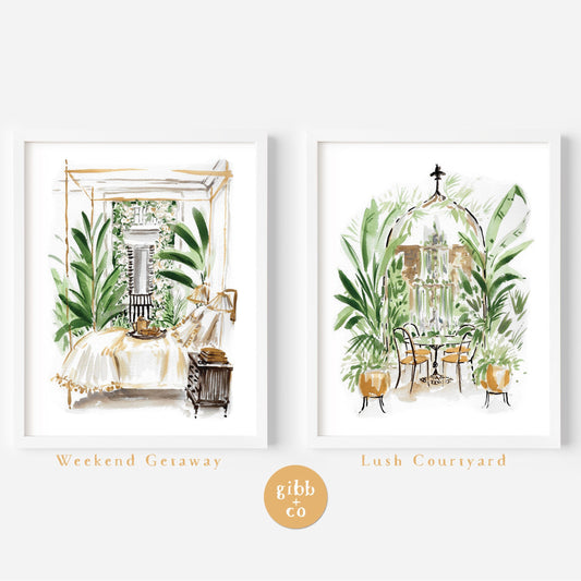 Weekend Getaway Travel art print, New Orleans, Charleston, Savannah, lush, plants, courtyard, weekend, garden art print