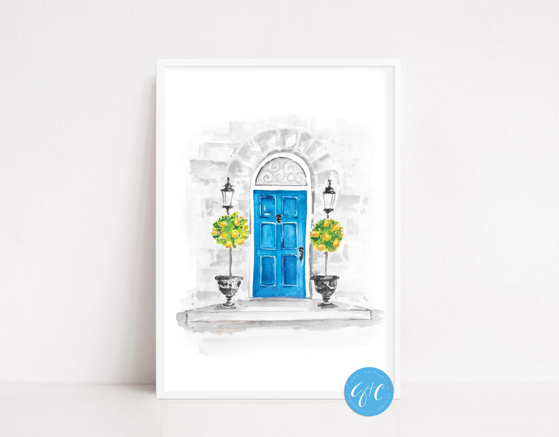 "Blue Door Lemon Topiary" art print features my original watercolor illustration inspired by Italy.