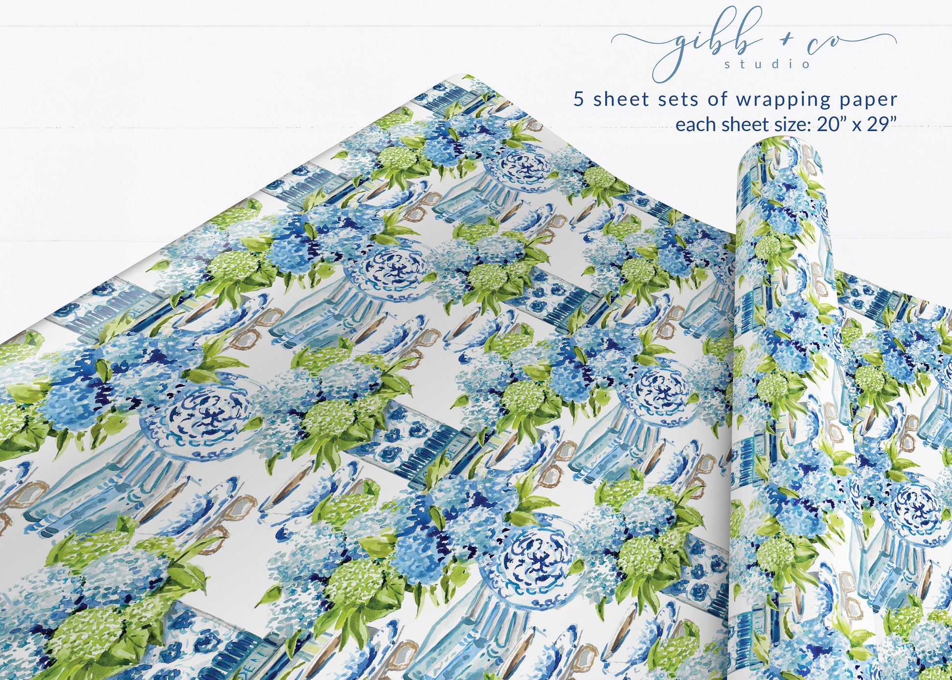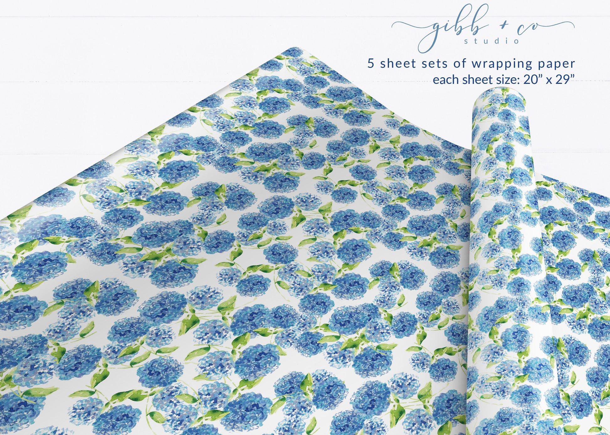 Whimsical blue hydrangeas patterned wrapping paper using my original watercolor illustrations. Choose from Blue Hydrangeas Flowers, Nantucket Hydrangeas Basket, or Hydrangeas and Books.