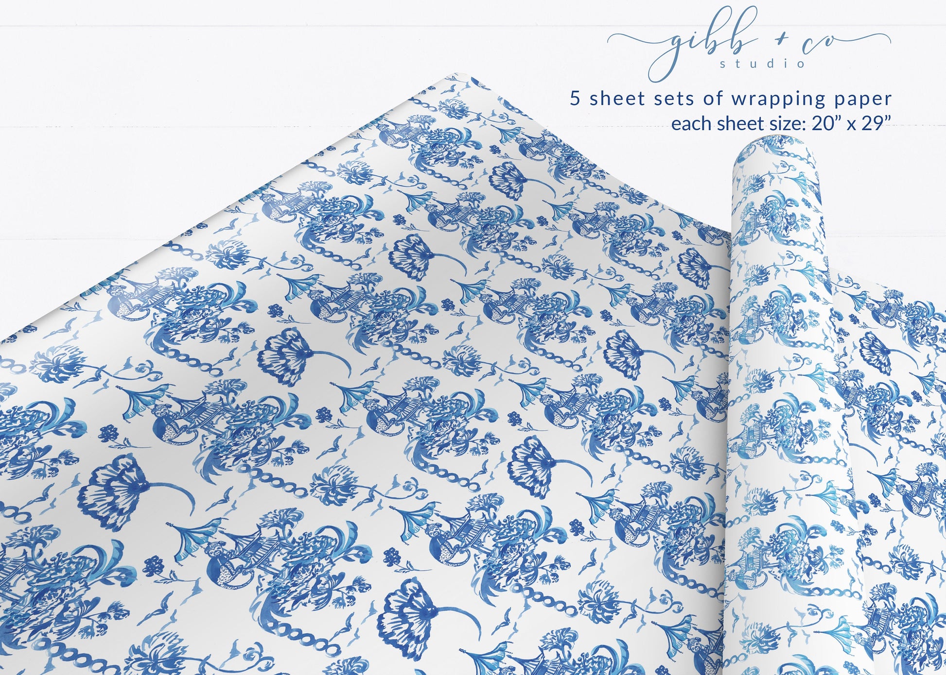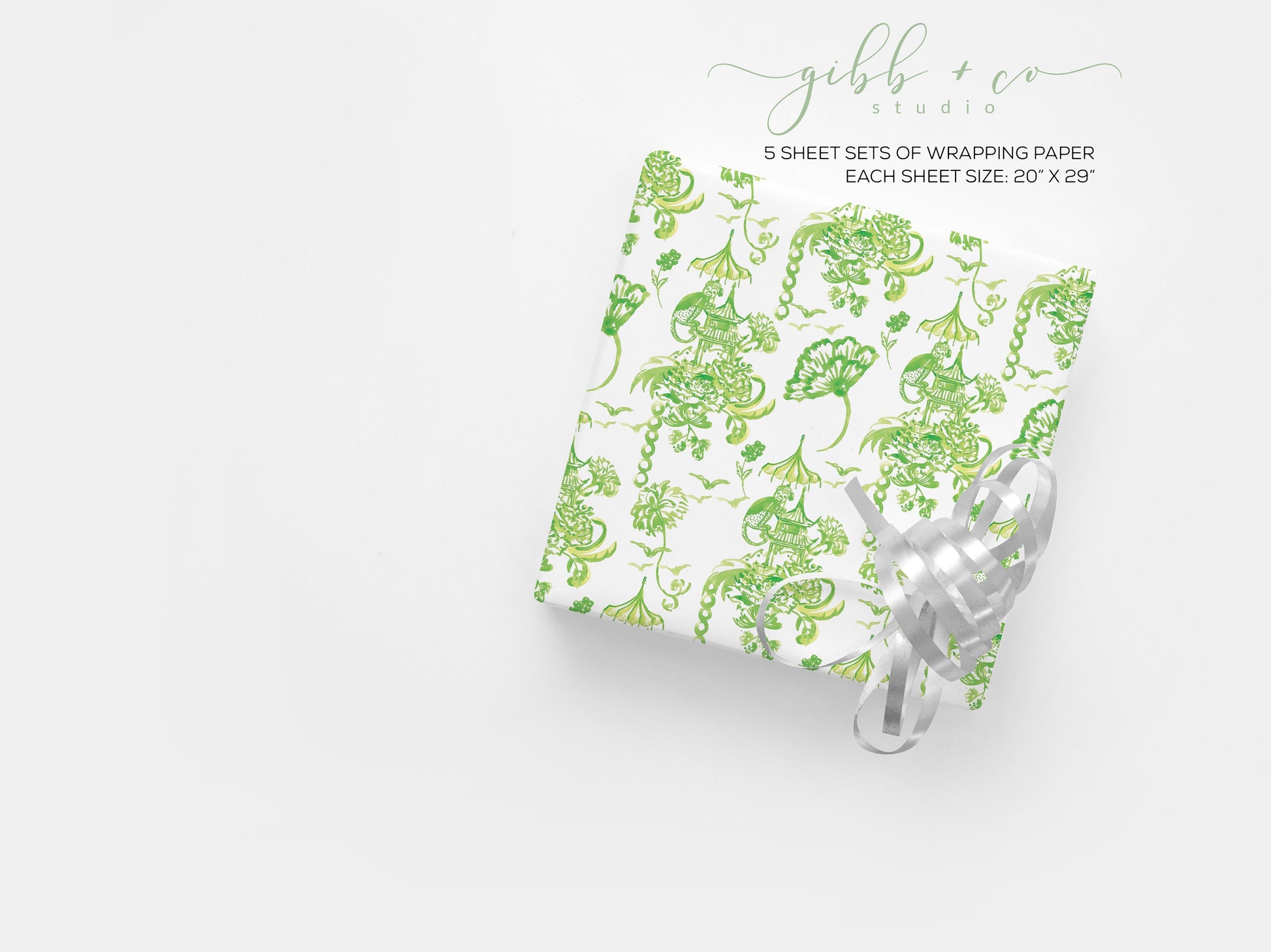 Whimsical monkey chinoiserie patterned wrapping paper using my original watercolor illustrations. Choose from blue, pink, orange or green.