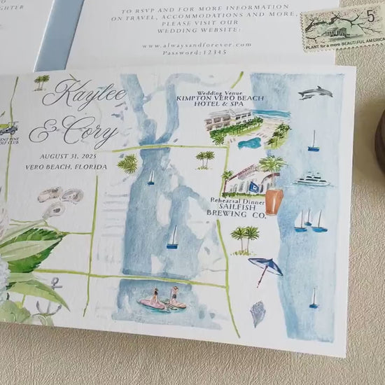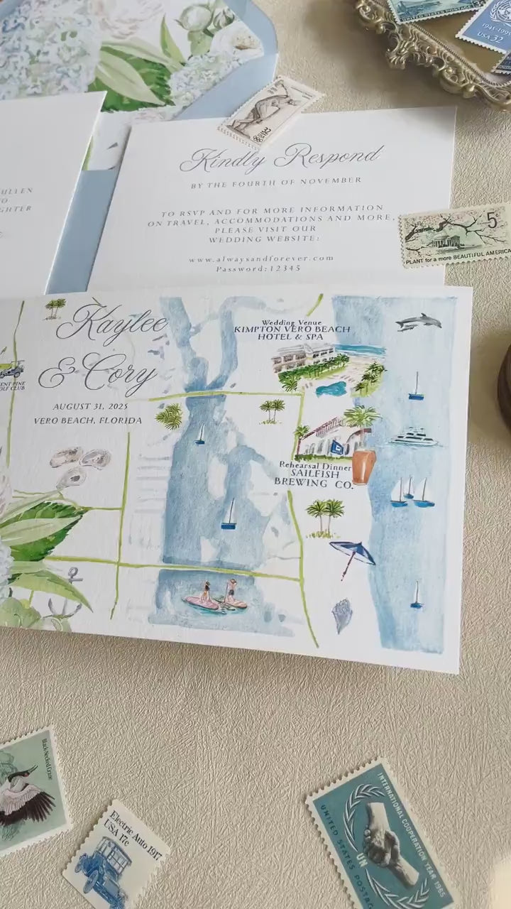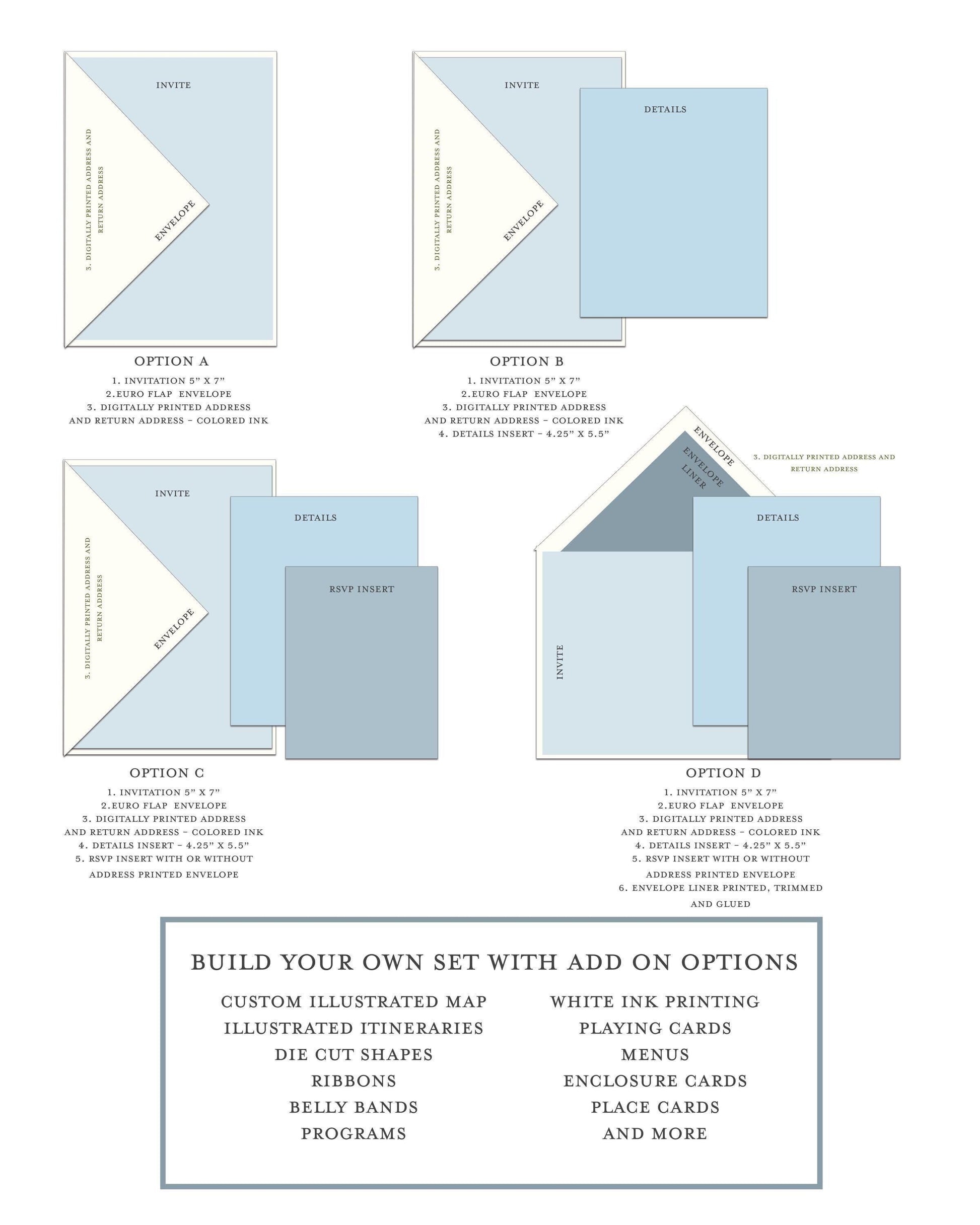 Start with the semi custom invitation set then add fun extras like the illustrated maps and itinerary. See the shop section for maps and itineraries.