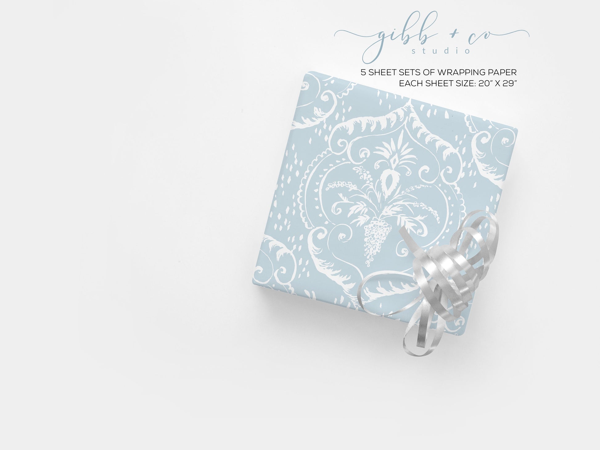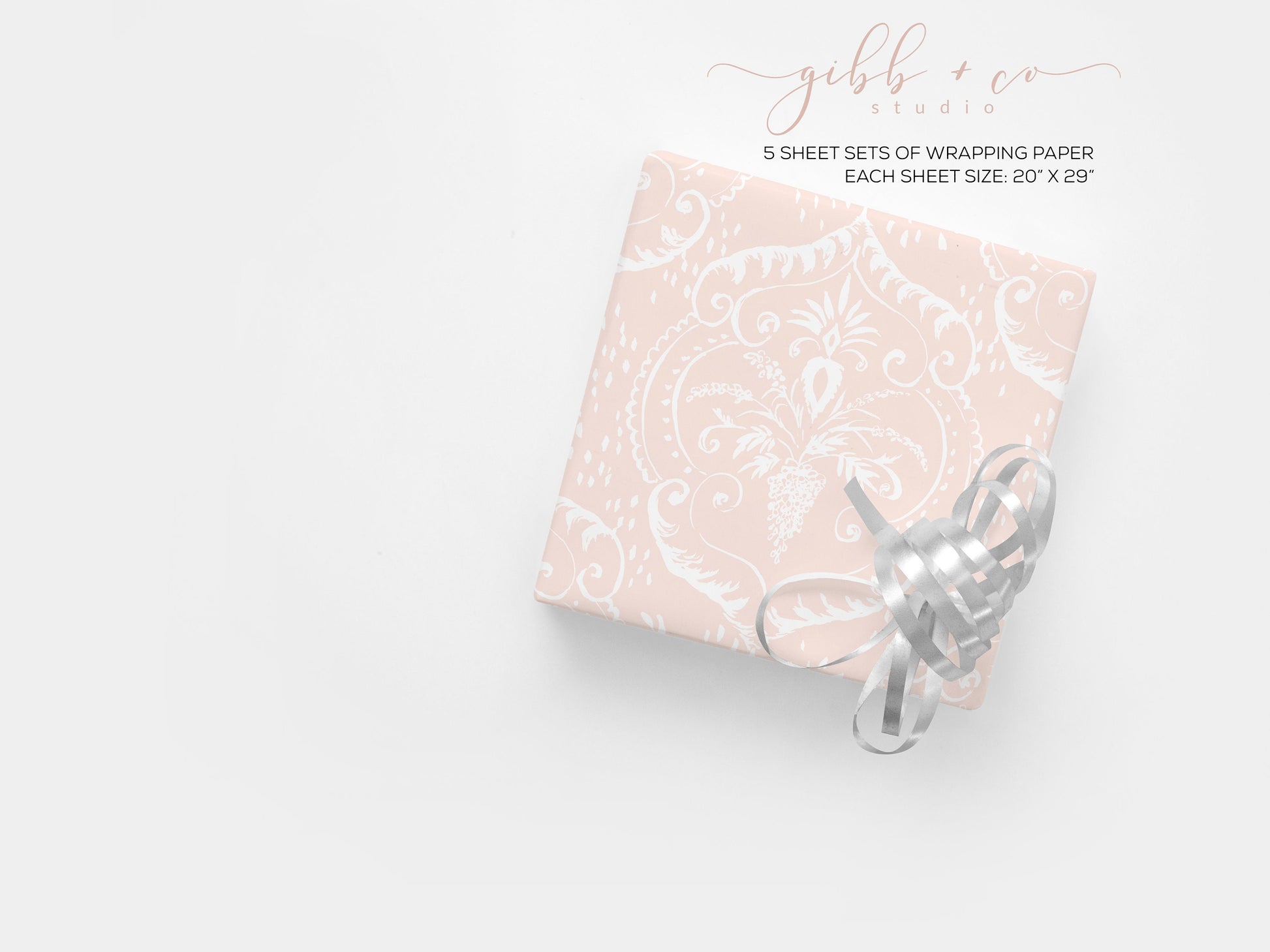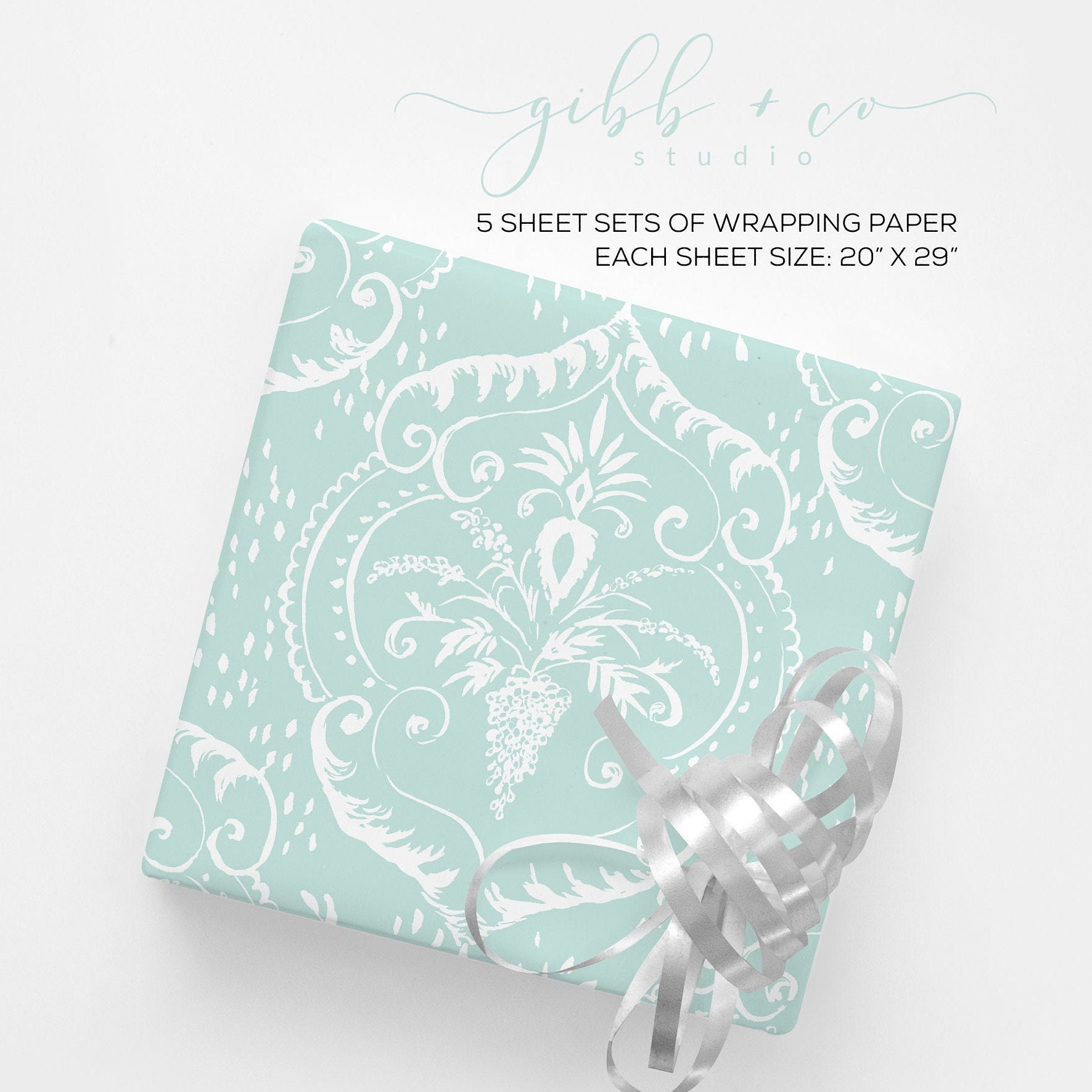 Whimsically illustrated damask wrapping paper. Choose from seafoam, pink, yellow, green, or blue.