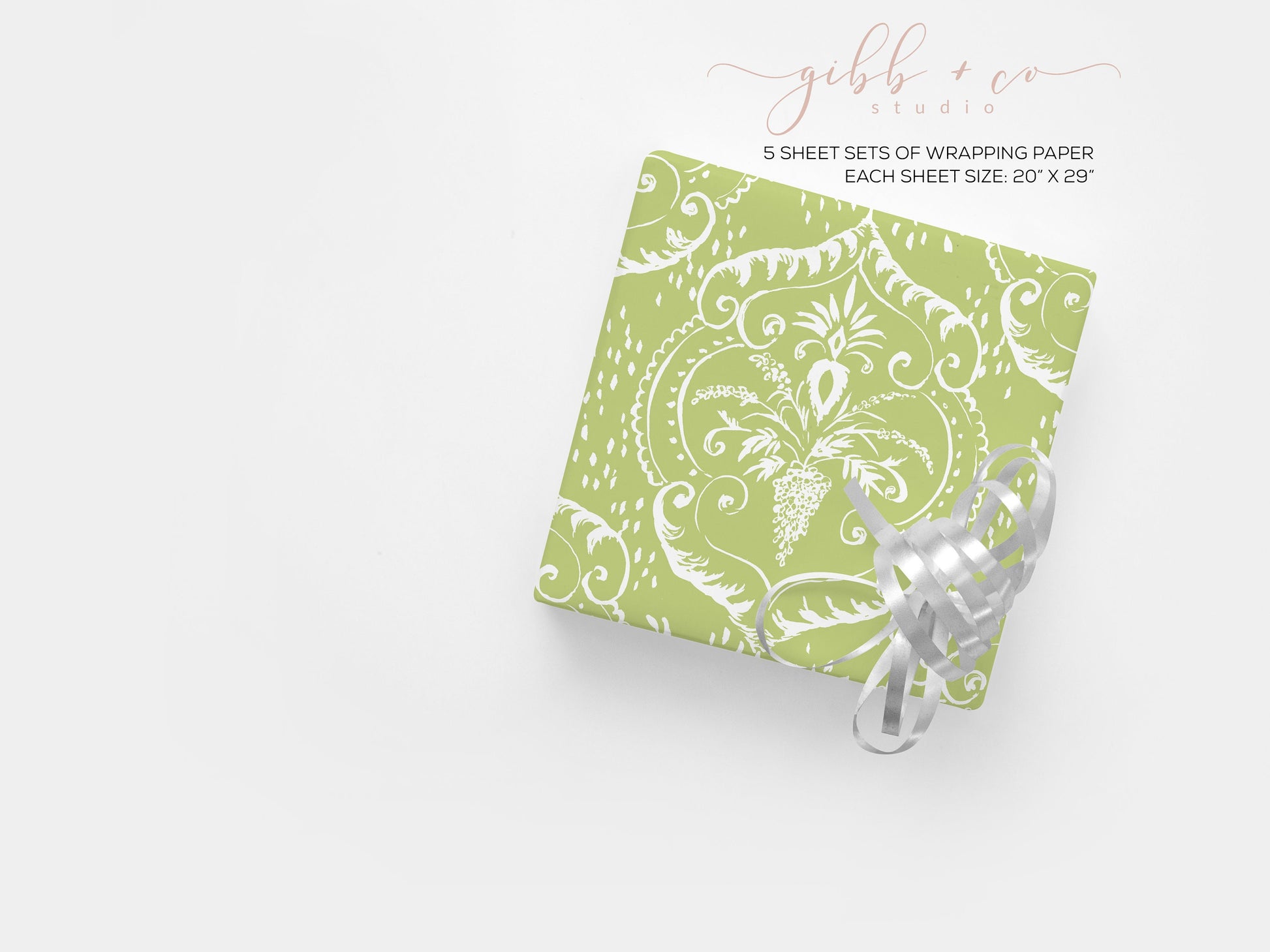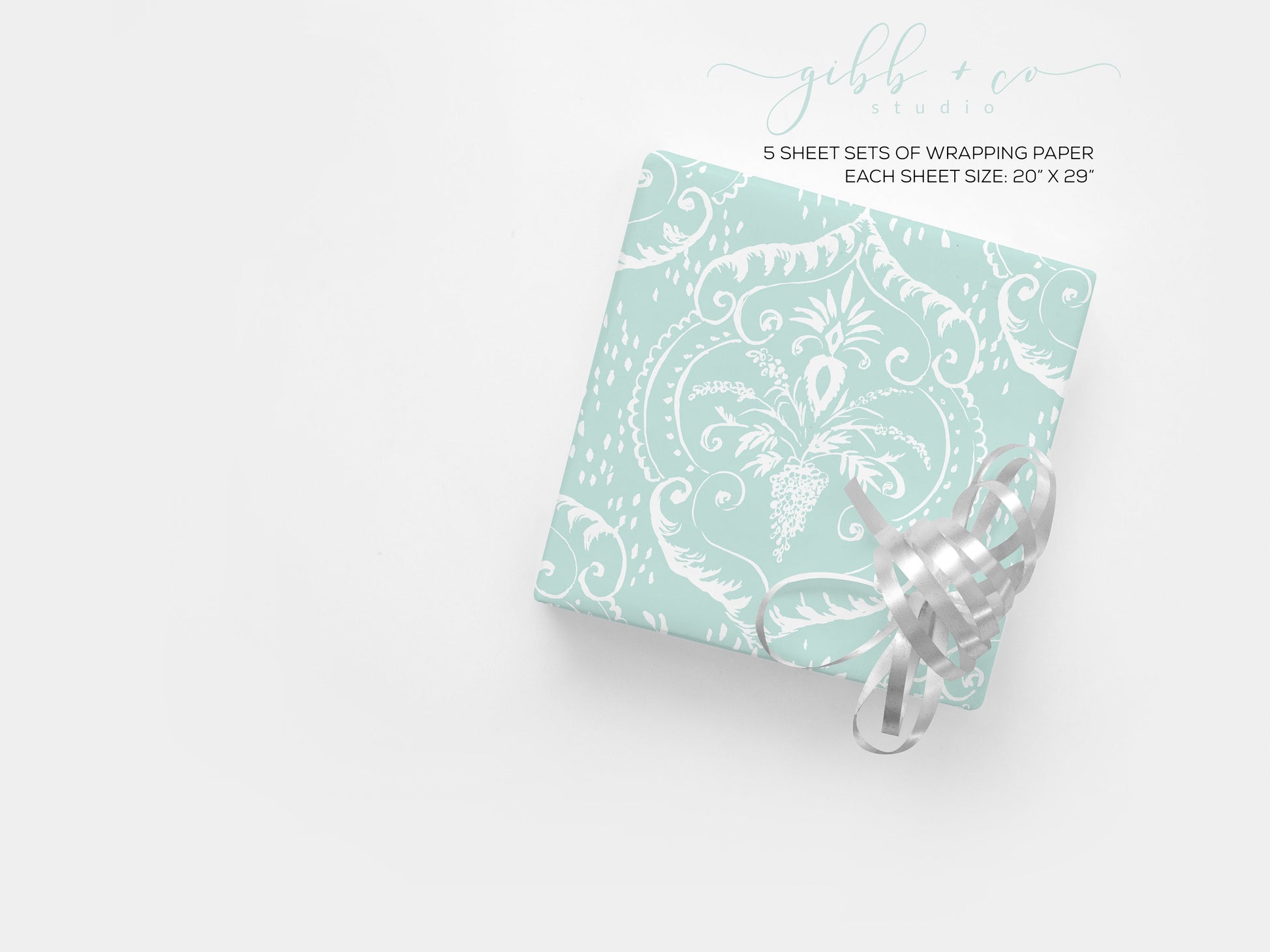 Whimsically illustrated damask wrapping paper. Choose from seafoam, pink, yellow, green, or blue.