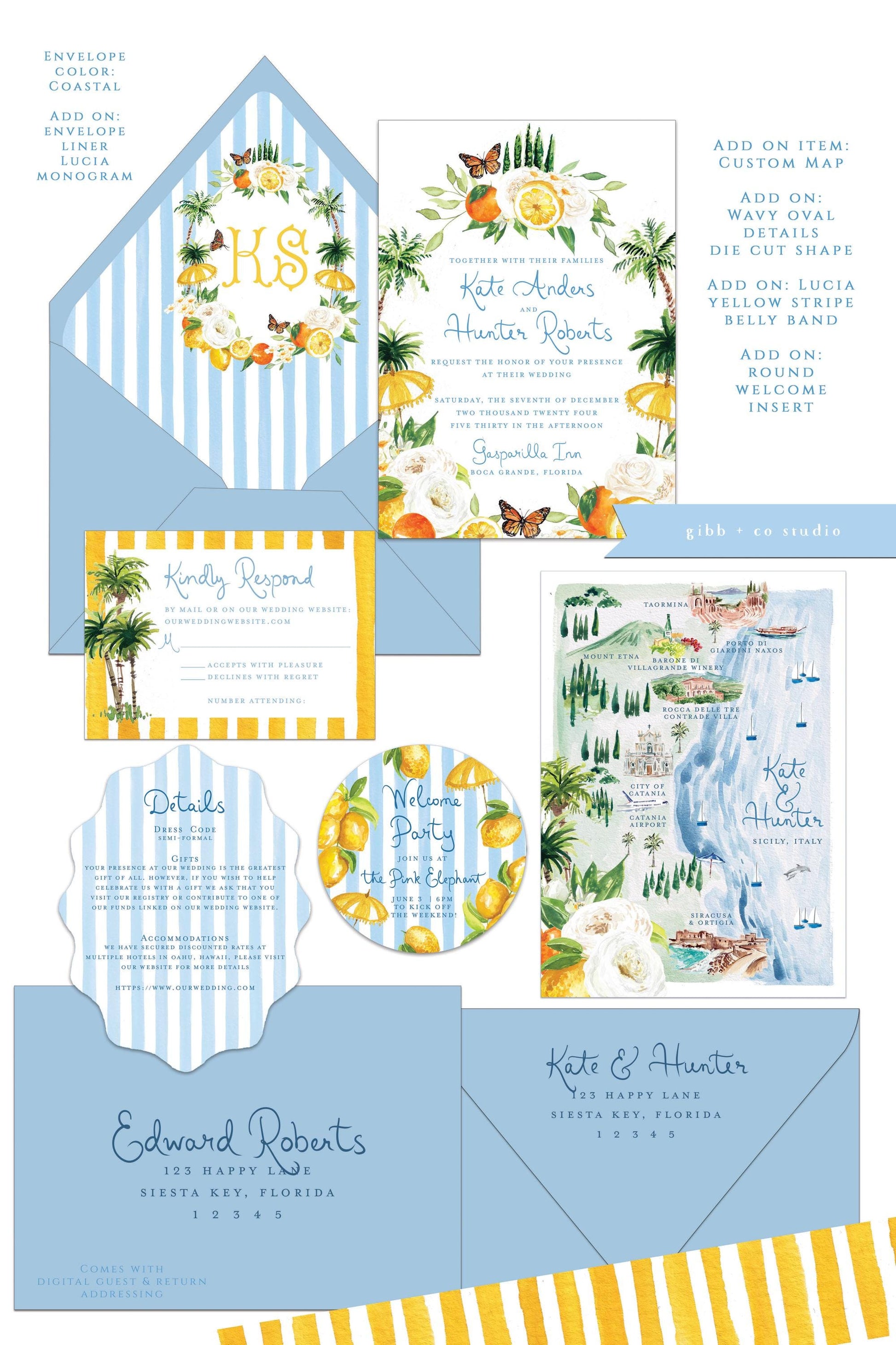 Deposit for the Lucia wedding invitation set for a Italy themeda wedding with blue and yellow watercolor details. Enjoy watercolor details for a soft and whimsical destination wedding invitation suite. The Lucia wedding set is part of the Semi Custom Collection in which you can change the font, font color and all text. Art changes are possible as an additional fee but will not be included in the preliminary mockup. Upgrade items can be added to your set for an additional fee.
