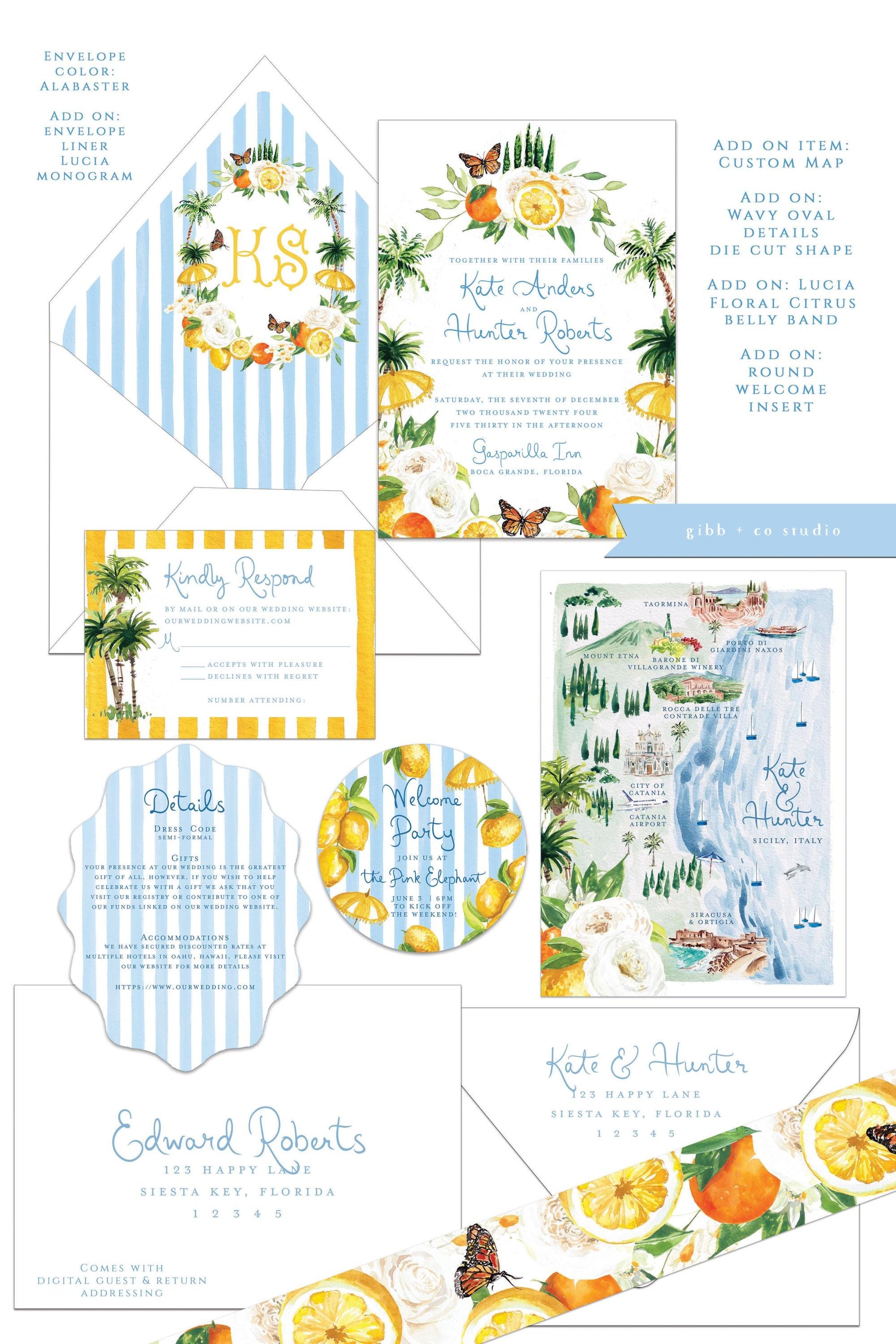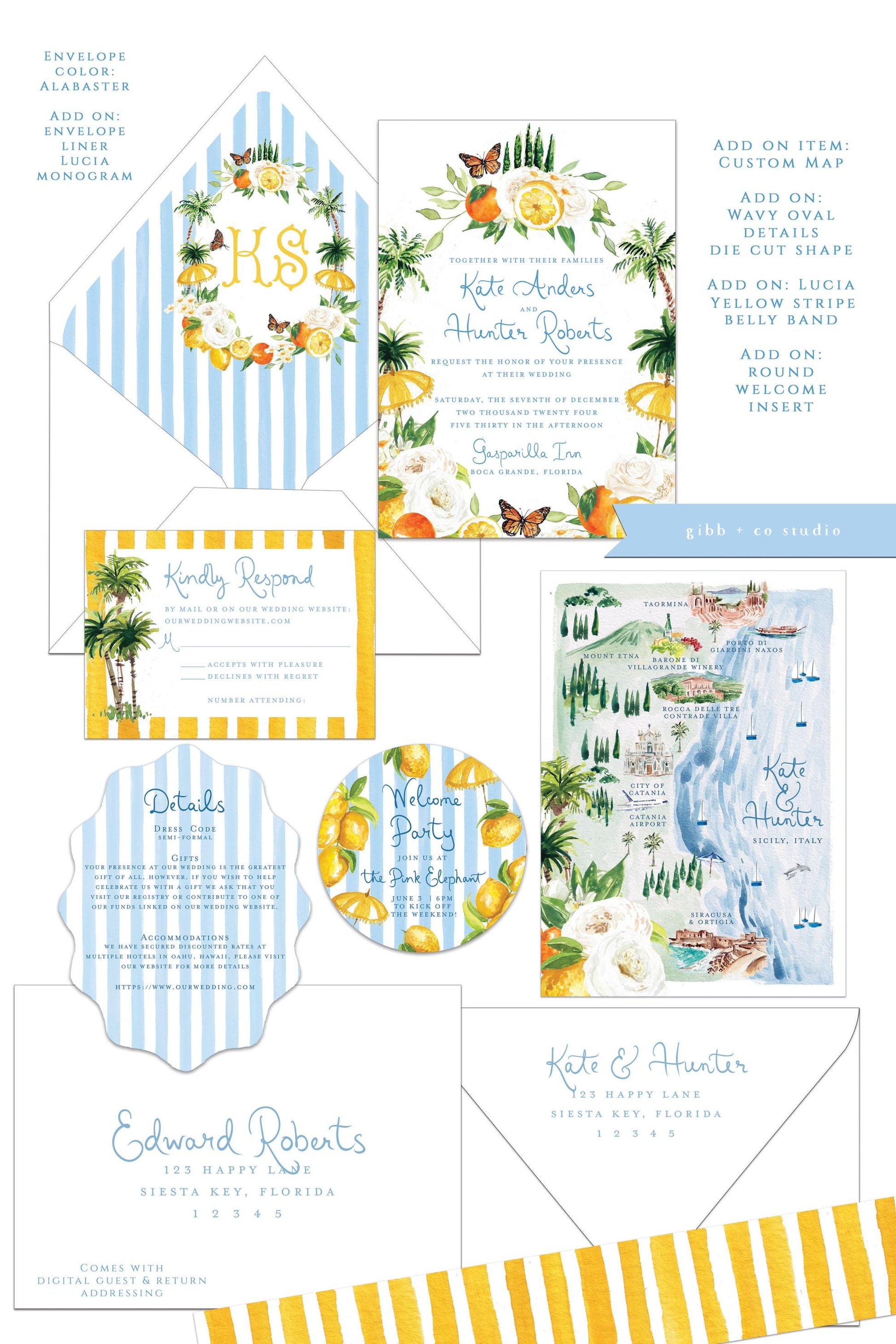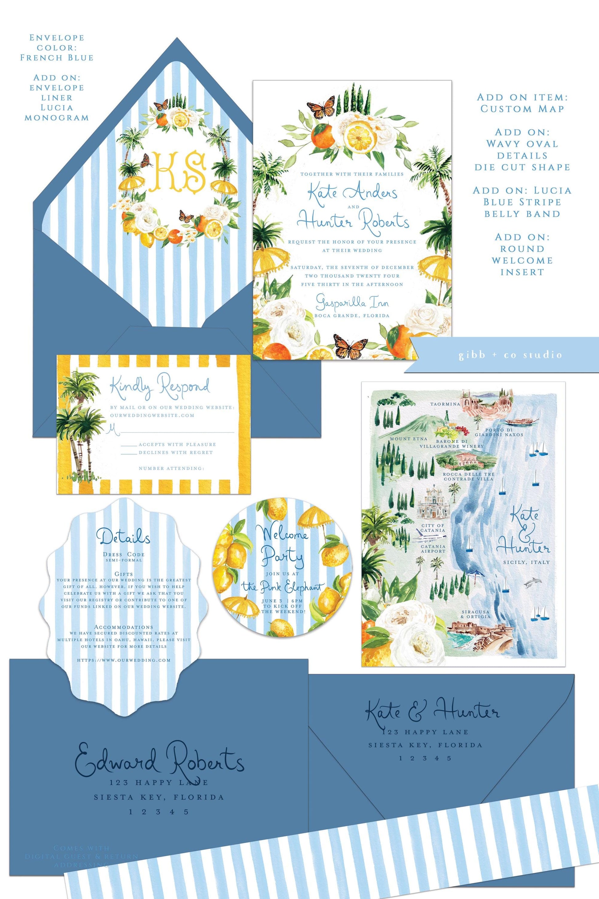 Start with the semi custom invitation set then add fun extras like the illustrated maps and itinerary. See the shop section for maps and itineraries.