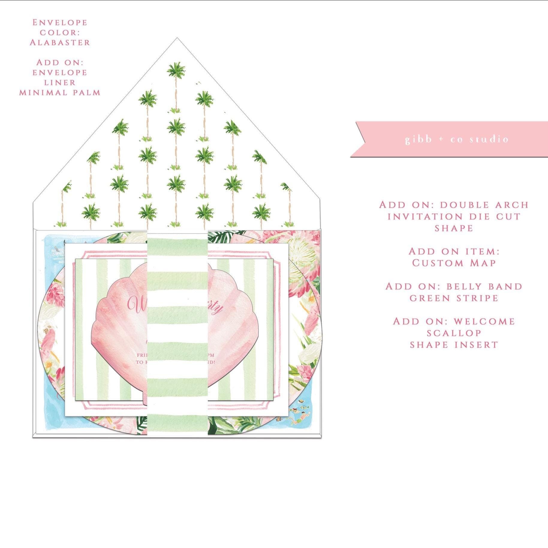 Deposit for the Lulu tropical wedding invitation set for a beach wedding with pink watercolor details. Enjoy watercolor details for a soft and romantic tropical wedding invitation suite. The Lulu wedding set is part of the Semi Custom Collection in which you can change the font, font color and all text. Art changes are possible as an additional fee but will not be included in the preliminary mockup. Upgrade items can be added to your set for an additional fee.