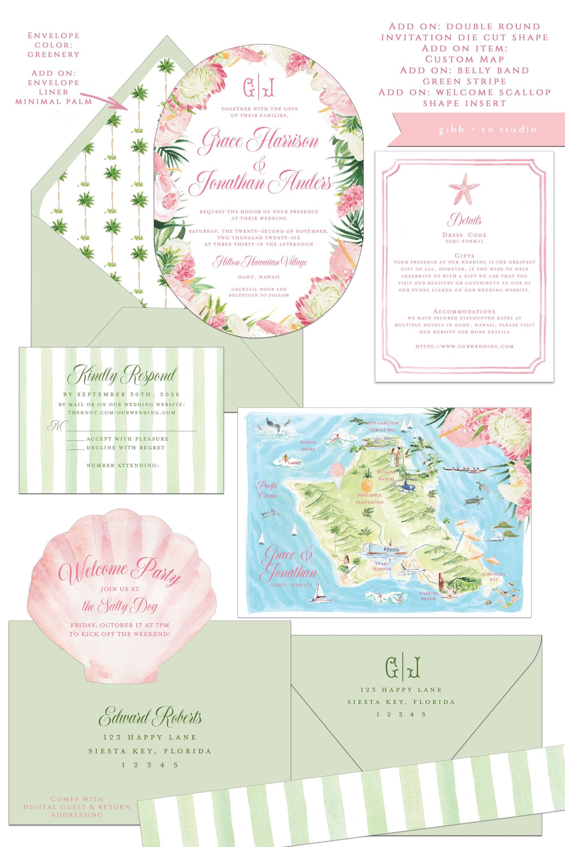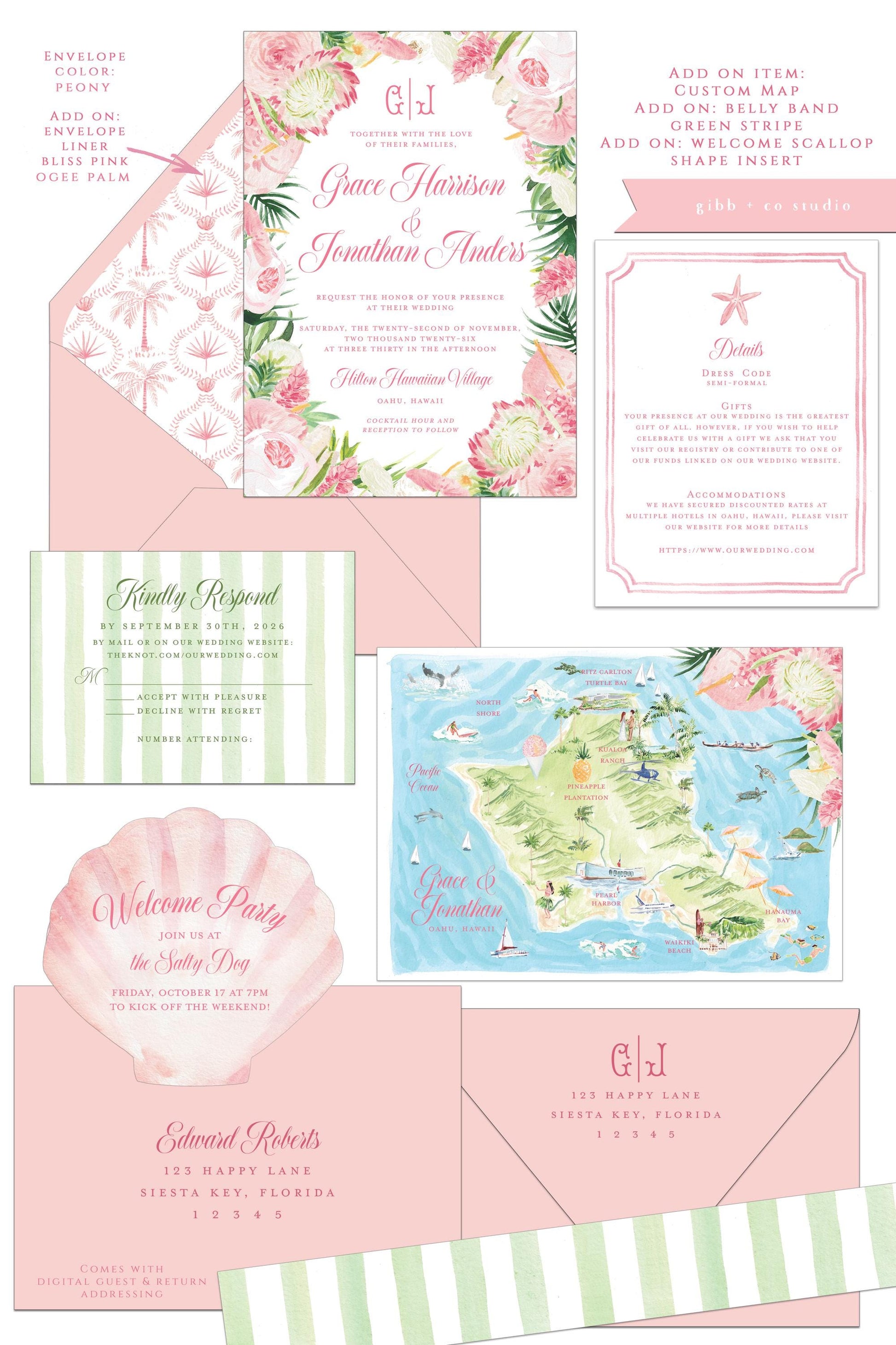 Start with the semi custom invitation set then add fun extras like the illustrated maps and itinerary. See the shop section for maps and itineraries.