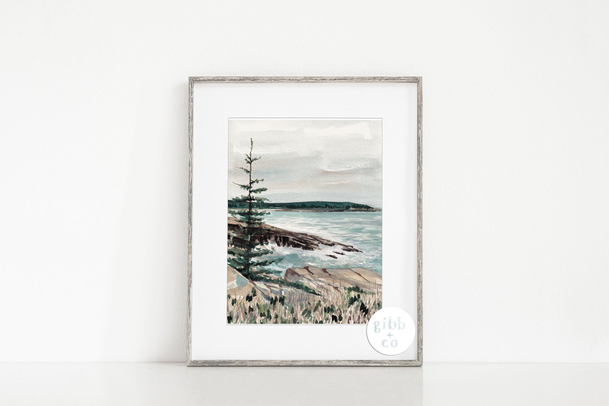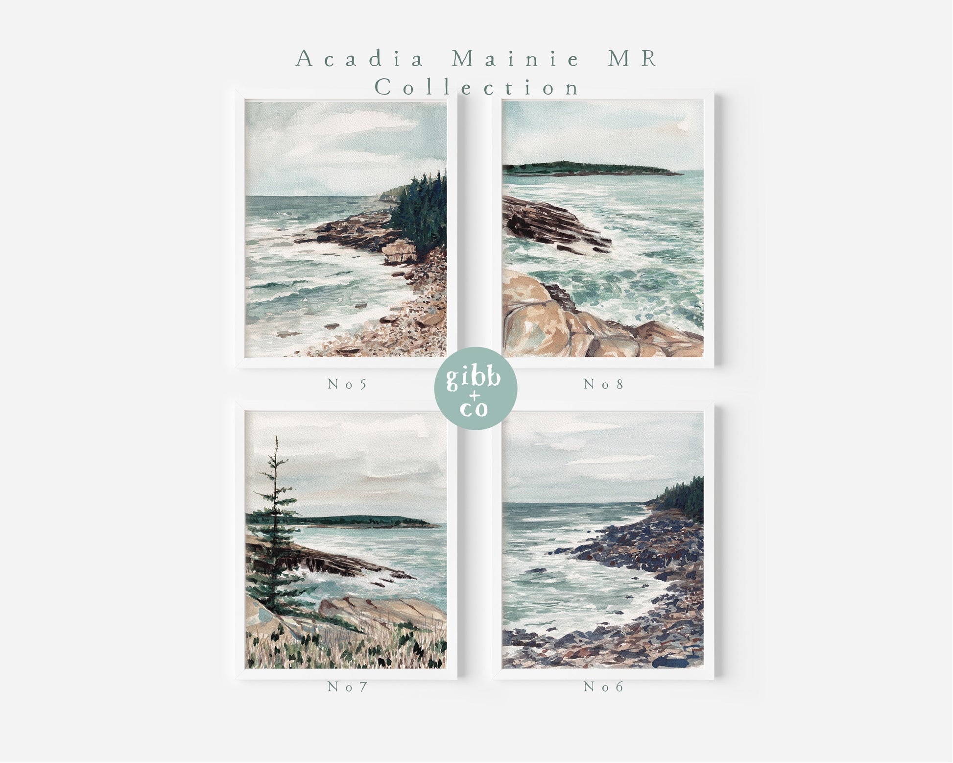 Maine travel art "Acadia National Park, Maine Modern Rustic Collection No. 5,6,7, and 8" is inspired by trip to Maine and features my original watercolor illustration. More muted and moody in colors compared to my light and airy Classic collection.