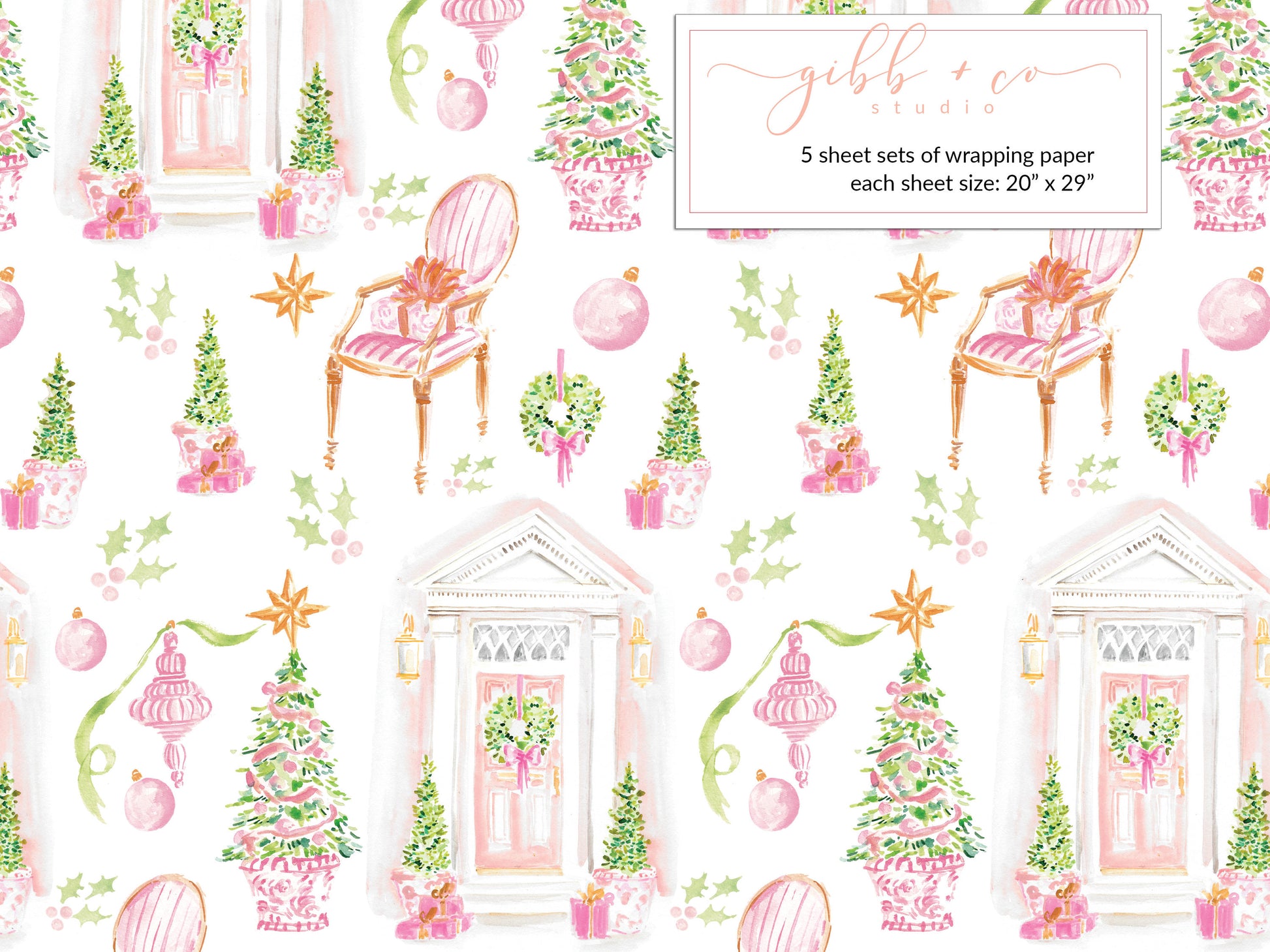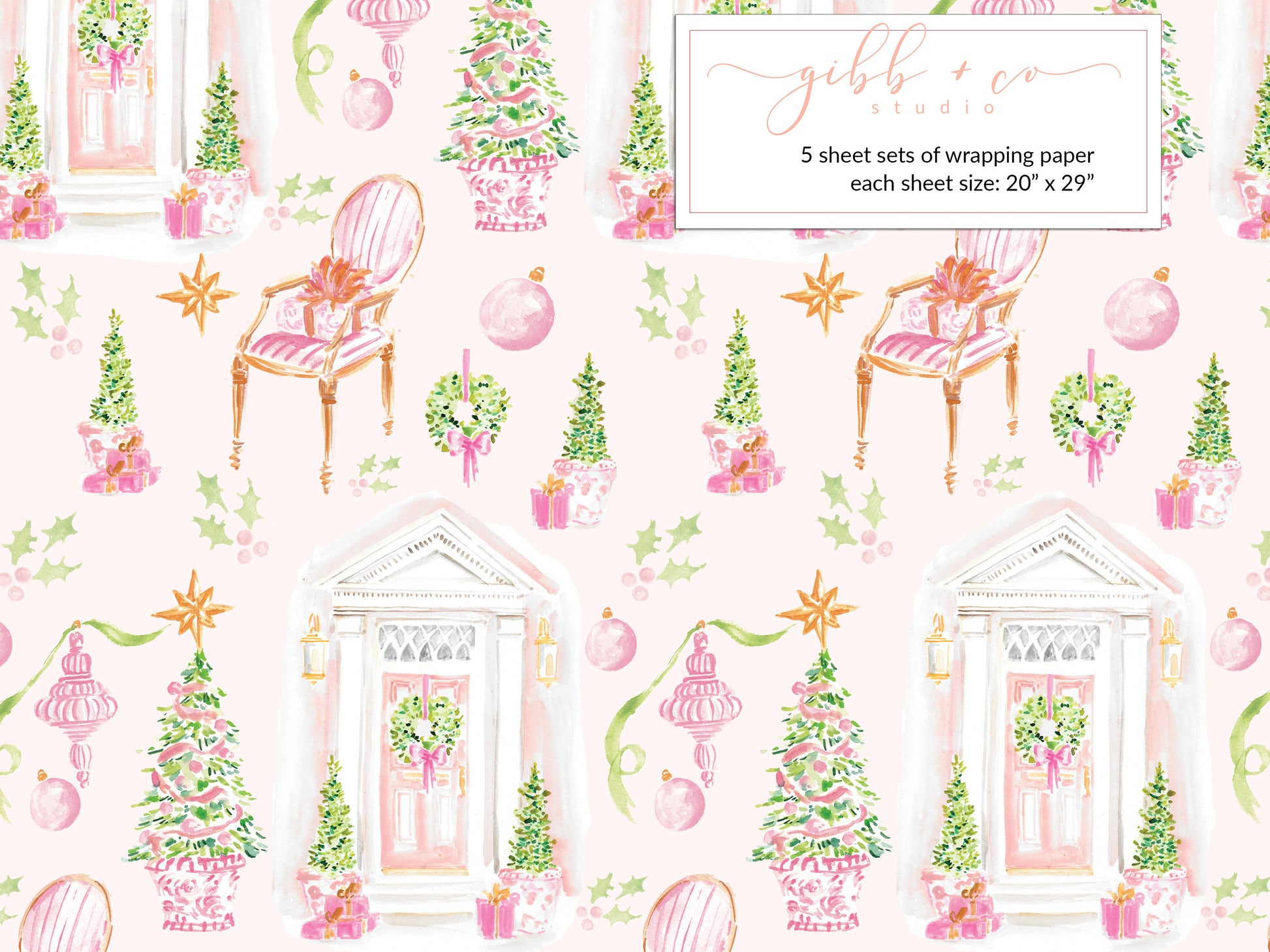 Watercolor Christmas illustrated wrapping paper using my watercolor Christmas Charleston pink door, chair, and holiday scene. Select from white or pink background.