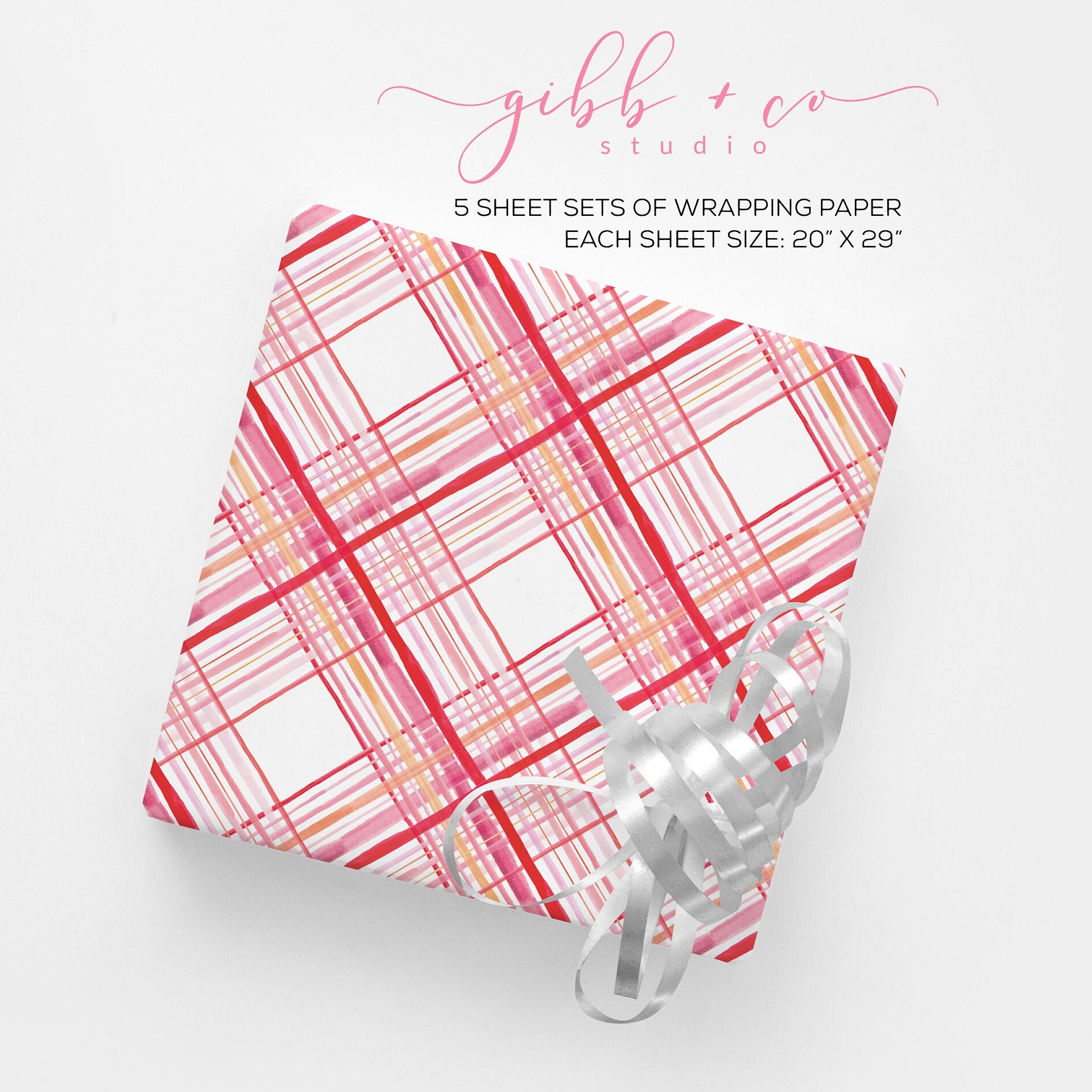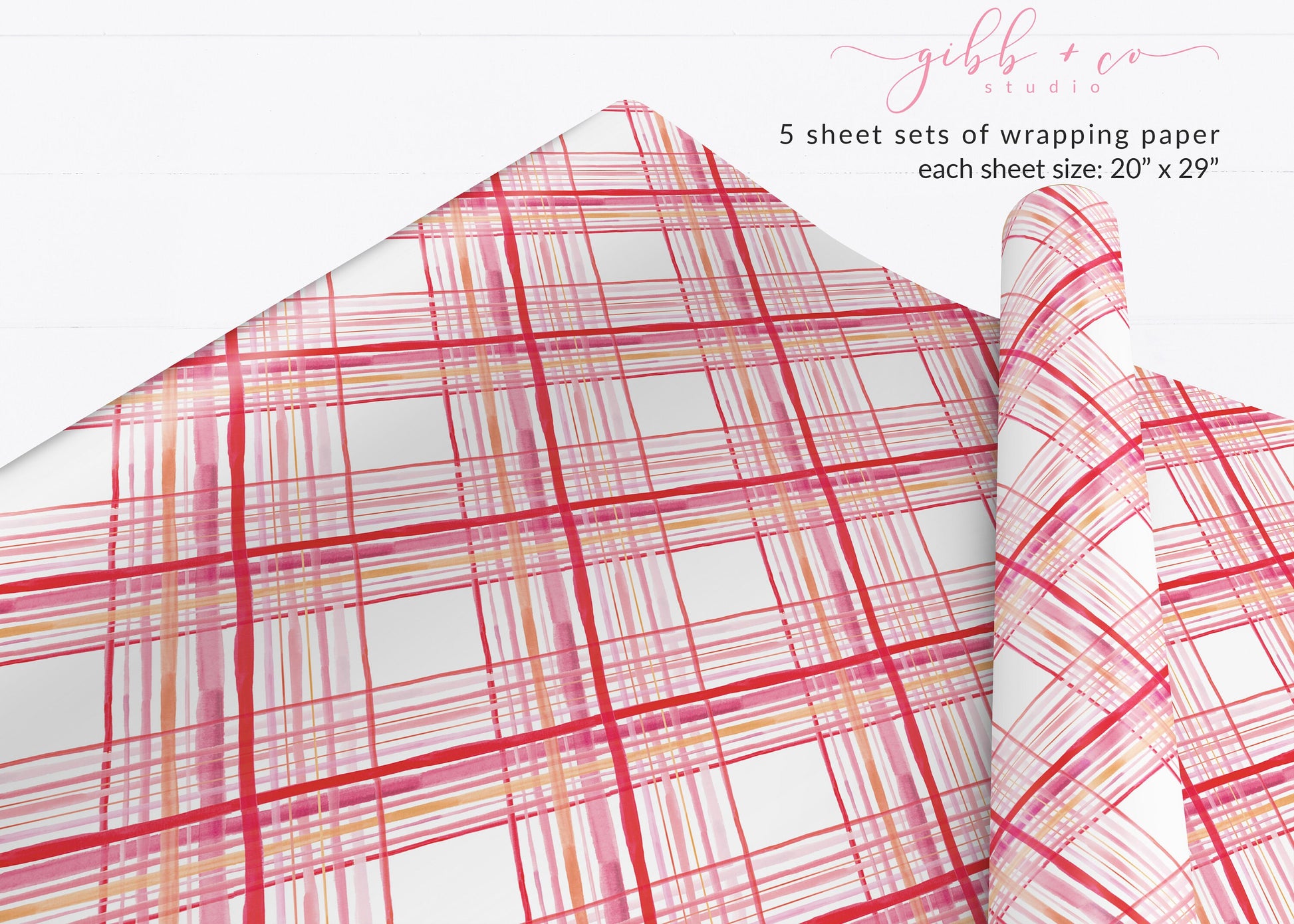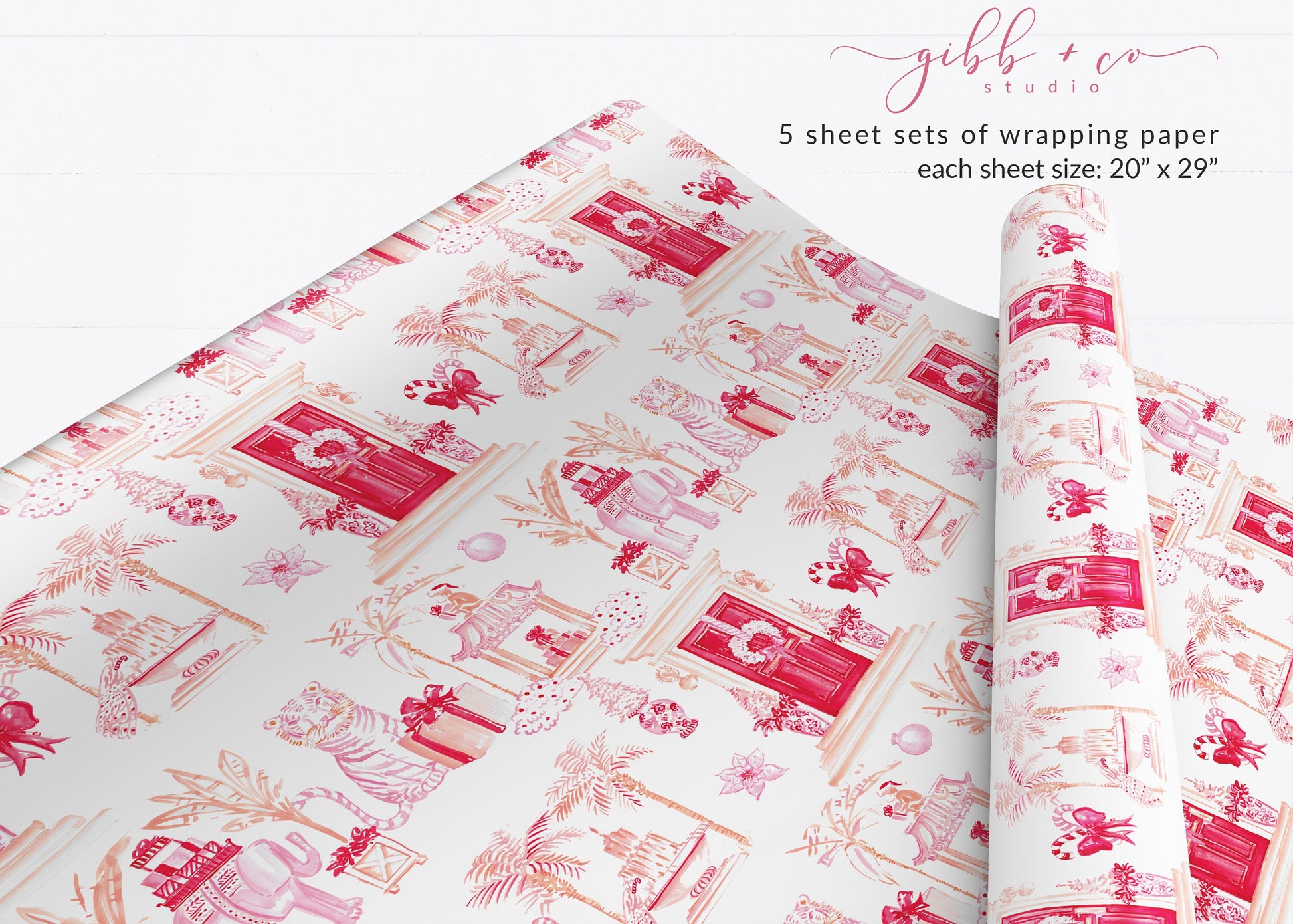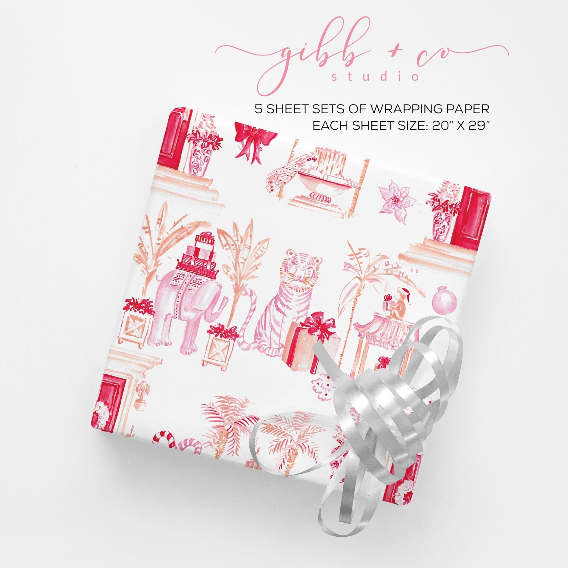 Watercolor pink Christmas chinoiserie illustrated wrapping paper using my whimsical exotic tiger, monkey, elephant, and peacock illustrations. Choose from pink or white background. Coordinating plaid available.