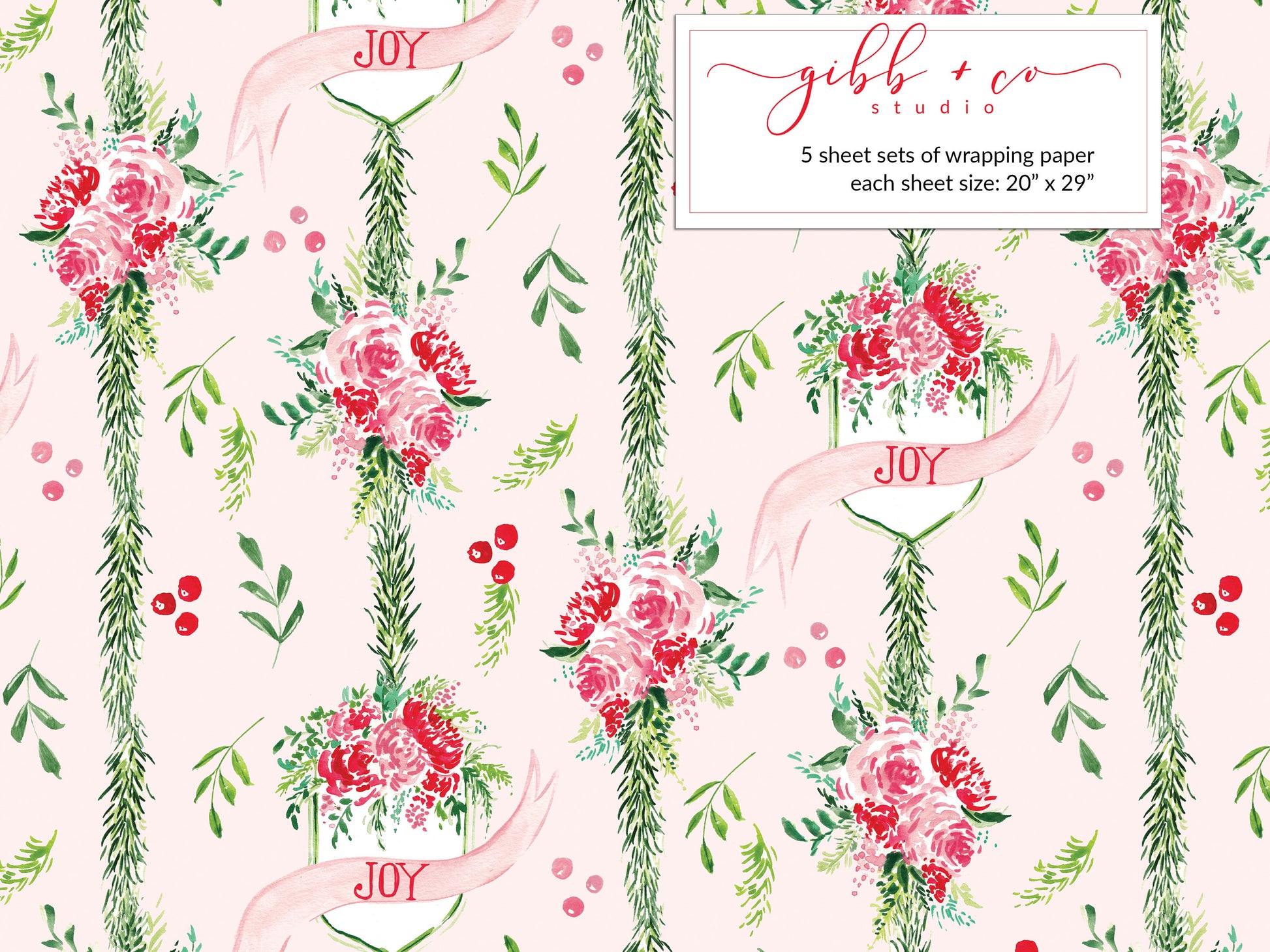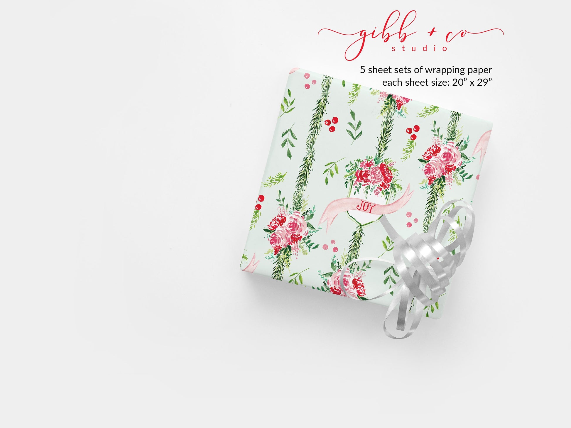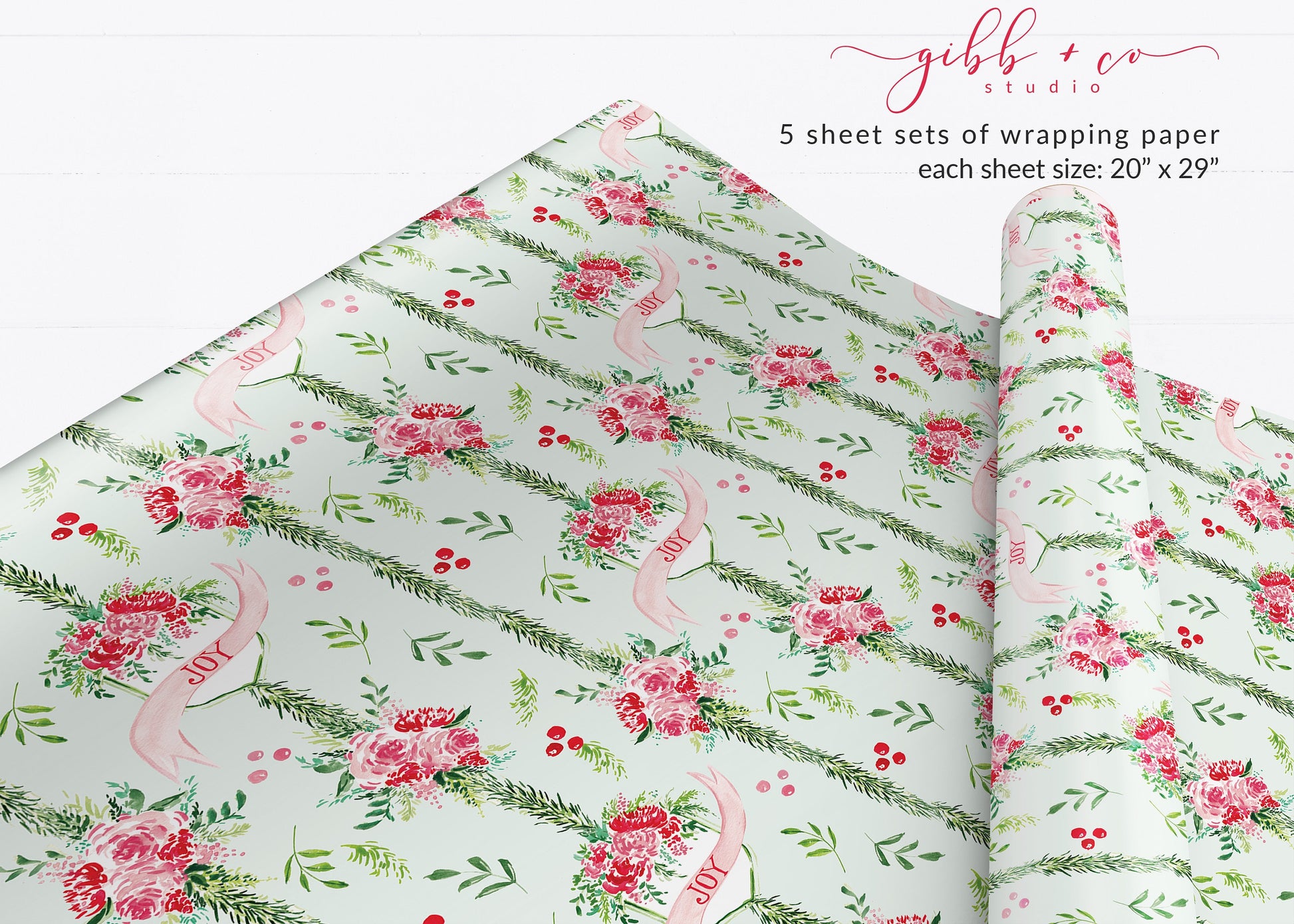 Retro Christmas floral illustrated wrapping paper using my watercolor flowers and holiday elements. Select from white, mint or pink background.