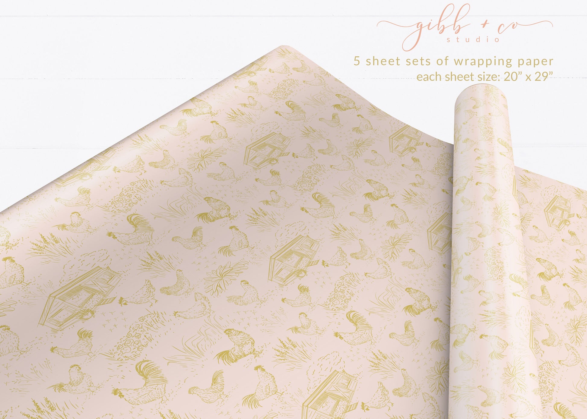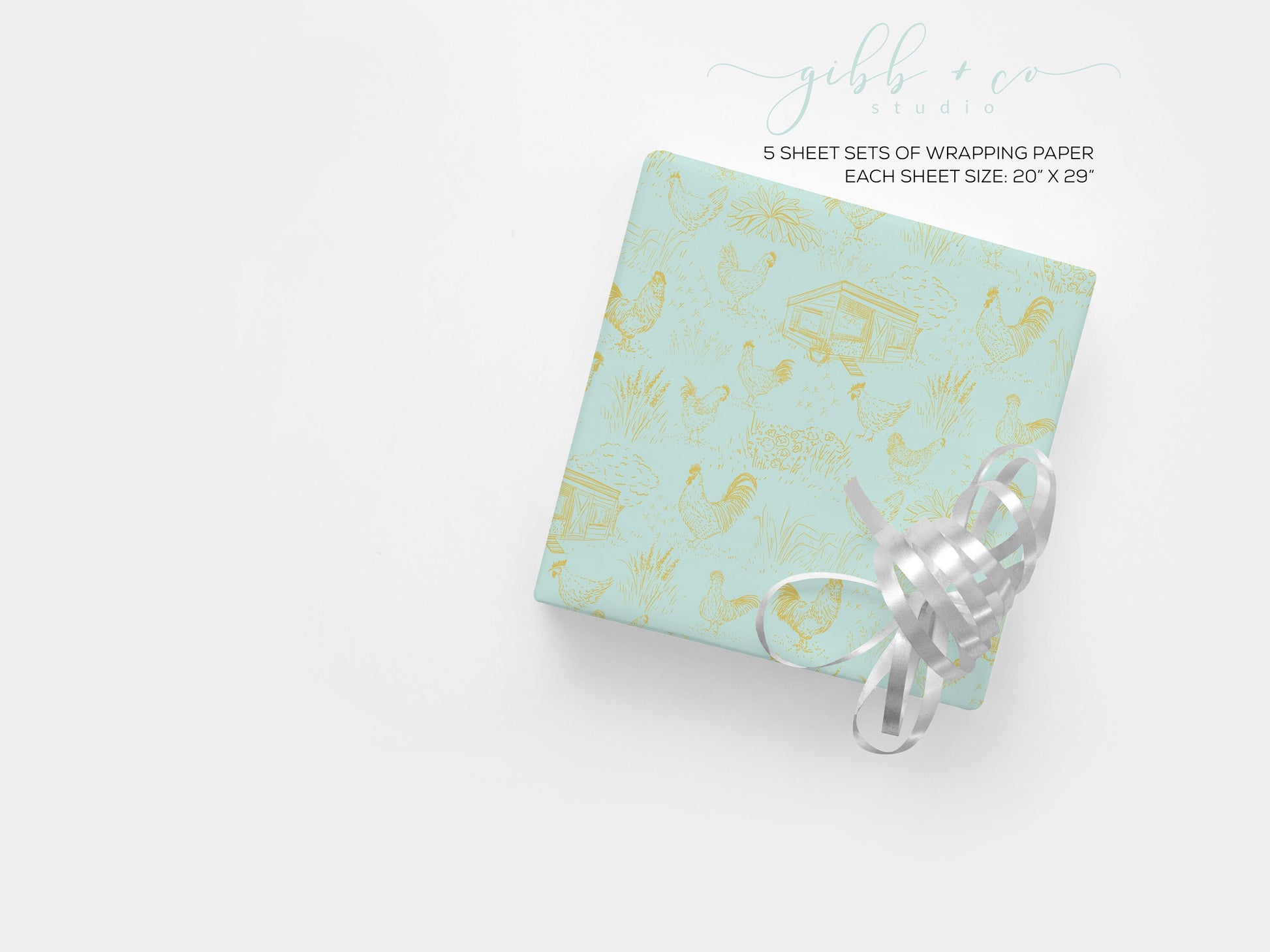 Whimsical toile chicken farm illustrated wrapping paper using my chicken illustrations. Choose from seafoam or pink background.
