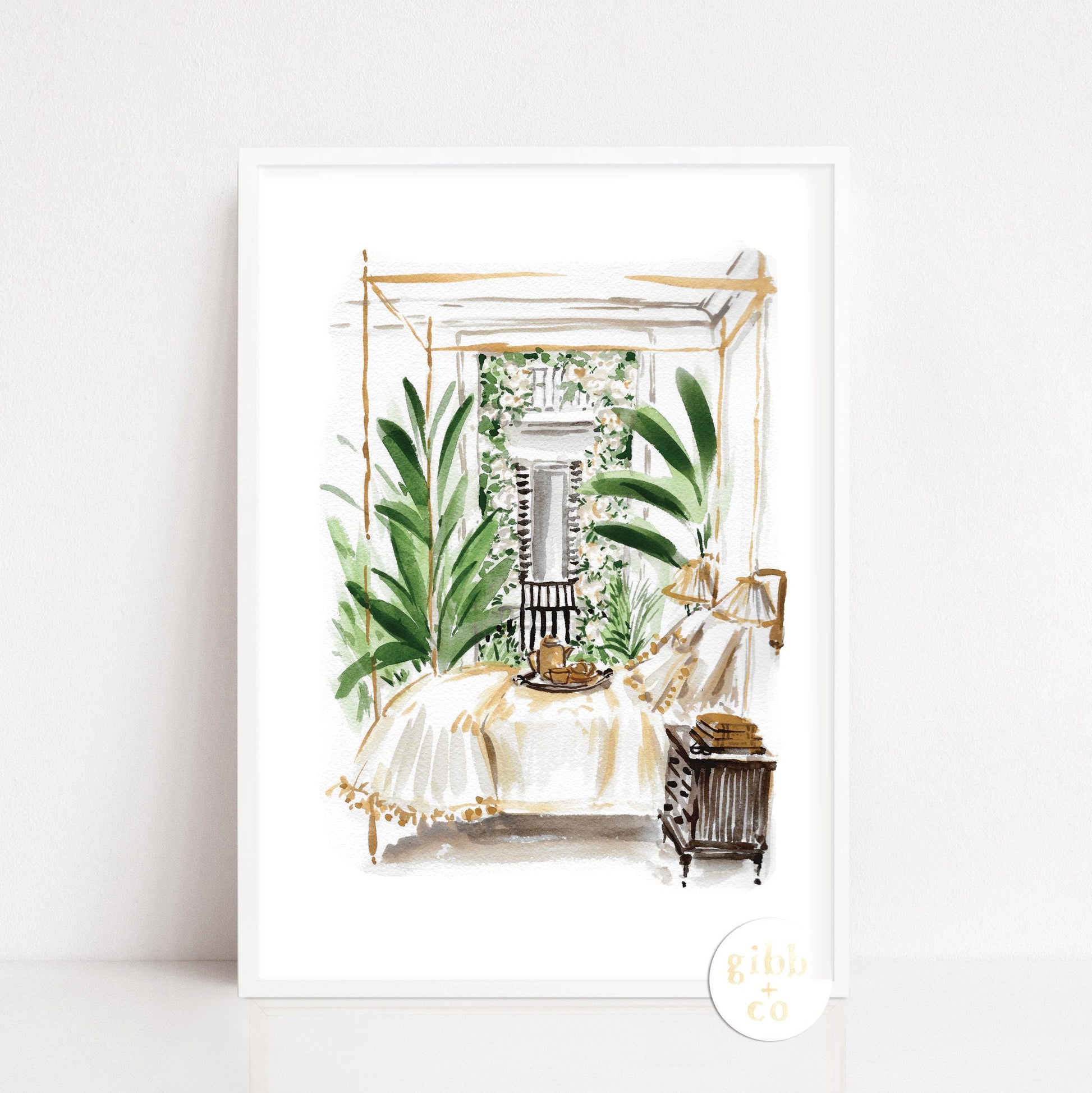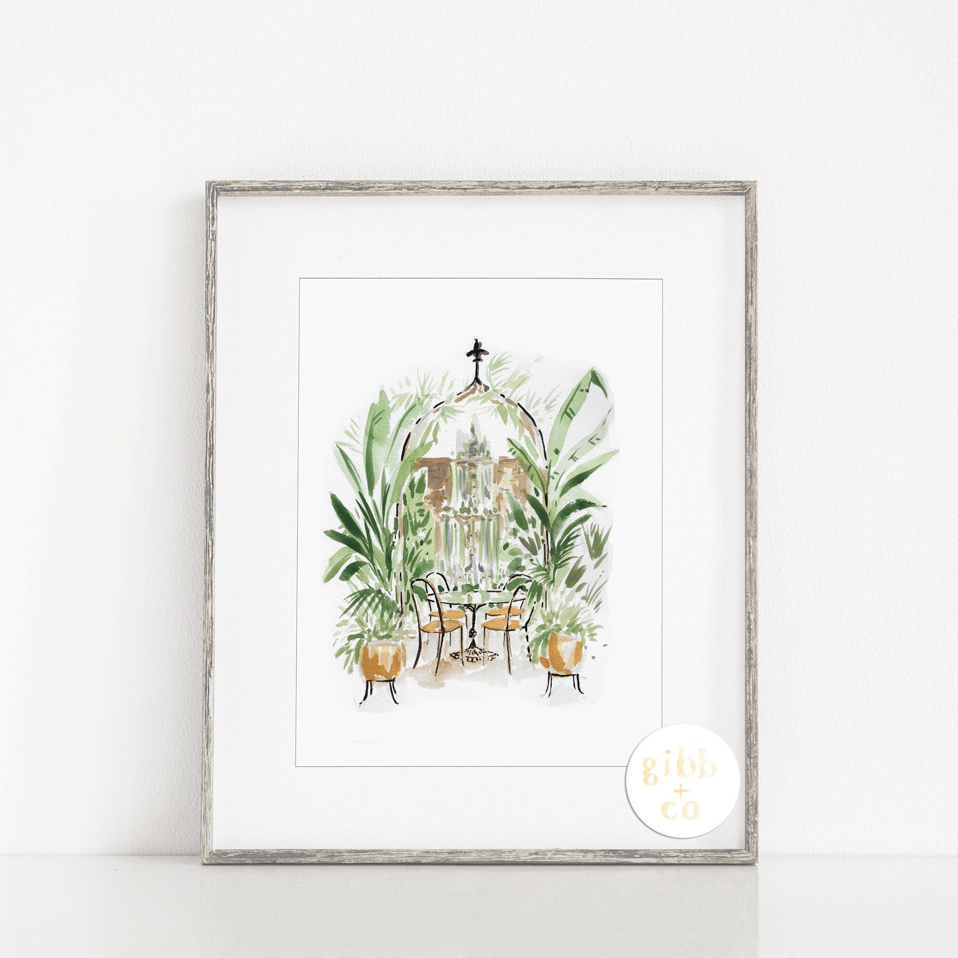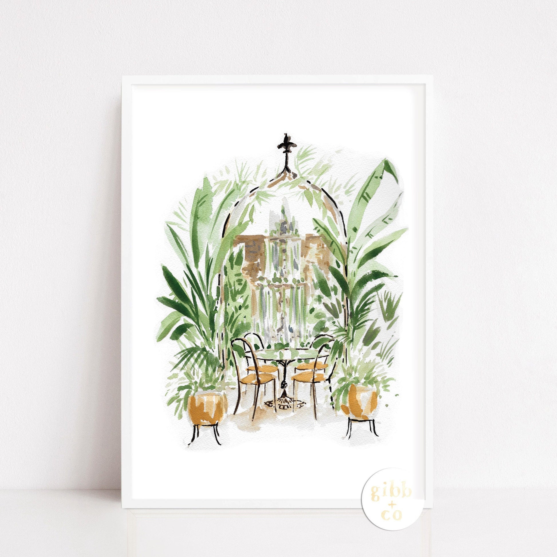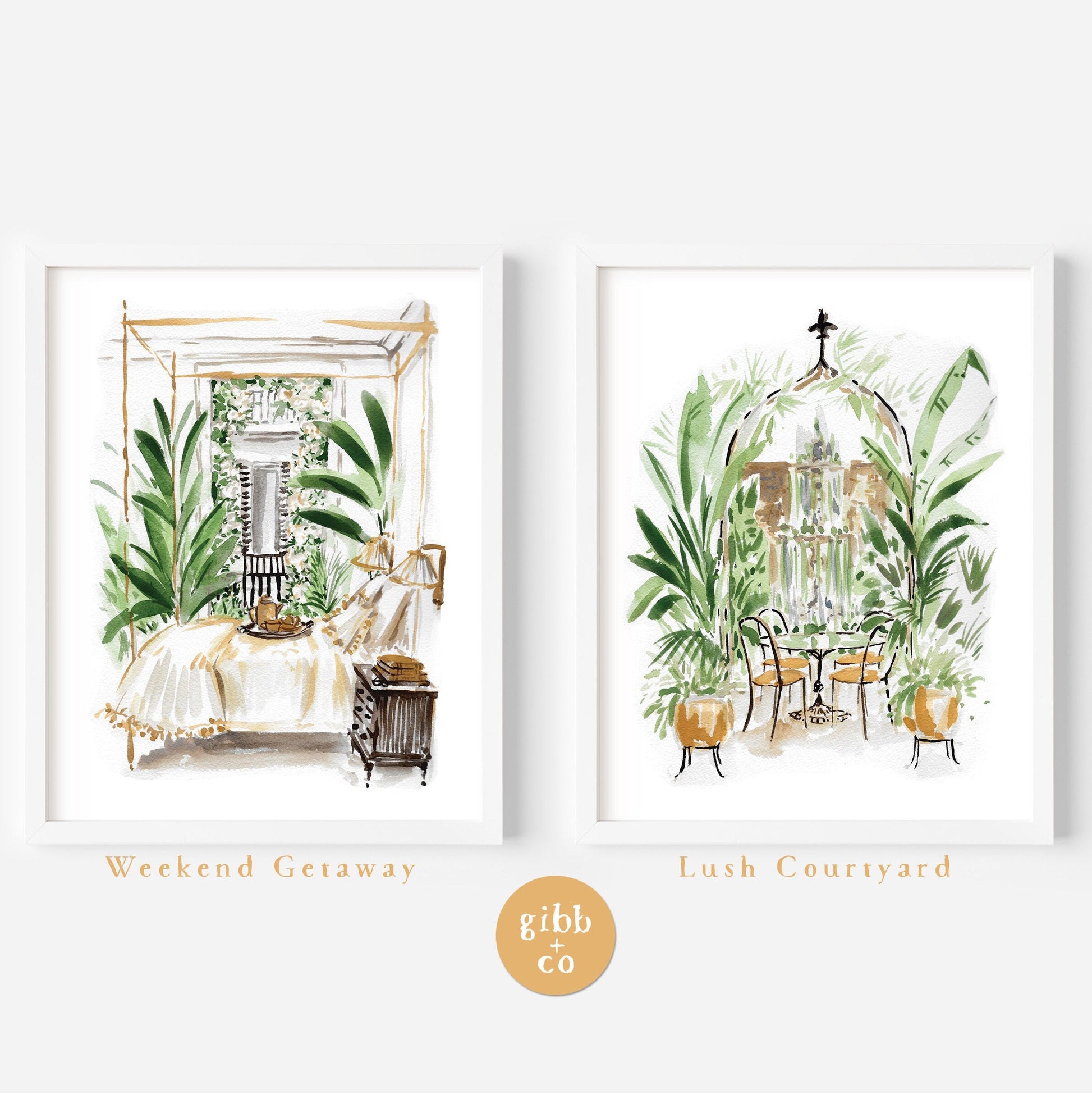 "Weekend Getaway" and "Lush Courtyard" whimsical art prints for the travel lover and features my original watercolor illustration. Inspired by my travels to some lovely southern cities like New Orleans, Charleston, Savannah and more.